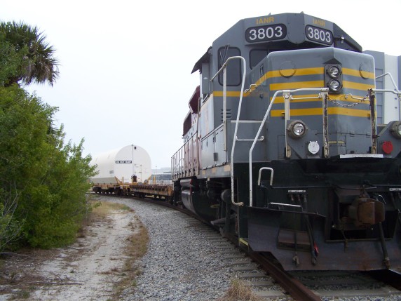 Switching services for NASA over its 37 mile railroad delivering the Pathfinder solid rocket booster test segments to NASA's Rotating Processing and Surge Facility. The Pathfinder program marks the beginning of NASA's mission to the Moon and Mars - the Artemis Program. The solid rocket booster segments are the initial thrust stages of NASA's Space Launch System (SLS) that will exceed the lunar landing Saturn 5 rocket as the most powerful rocket in history. Each solid rocket booster segment was conveyed on a specialty 8 axle rail car designed to support the booster segment's 500,000 lbs. of weight.